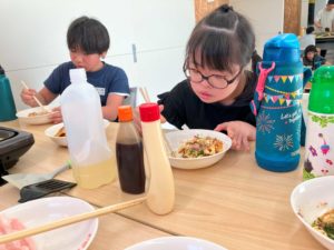 出来上がったお好み焼きとおにぎりをみんなで美味しく食べました!!