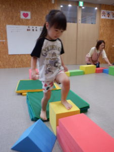 大型ブロックで作った凸凹道を足元をよく見て慎重に歩いたり…