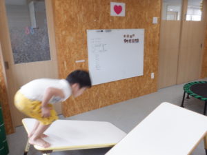 忍者のように、机から机へ飛び移ったり…