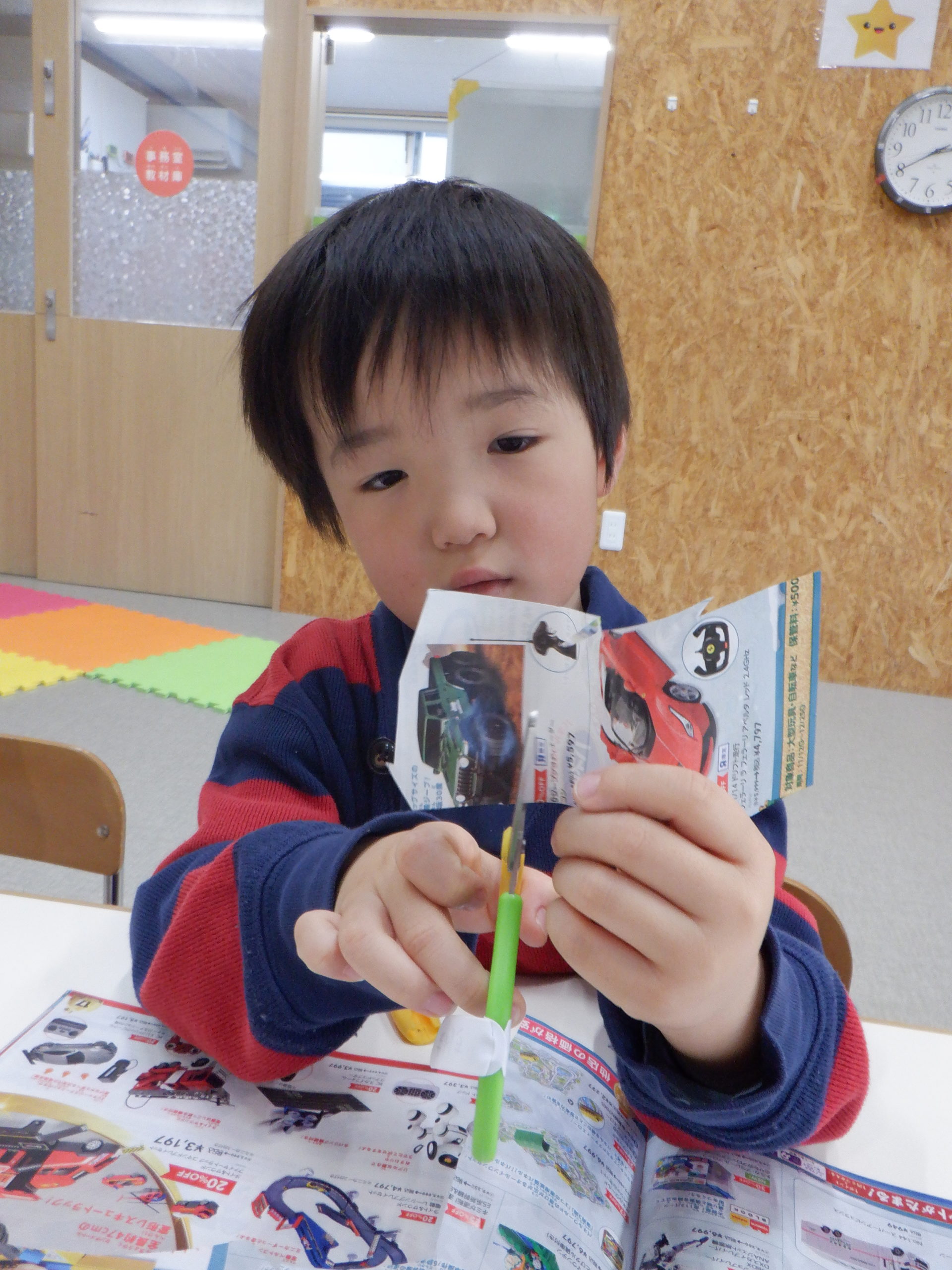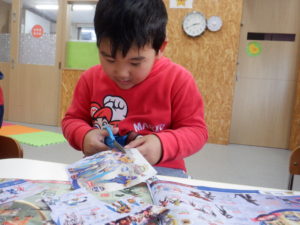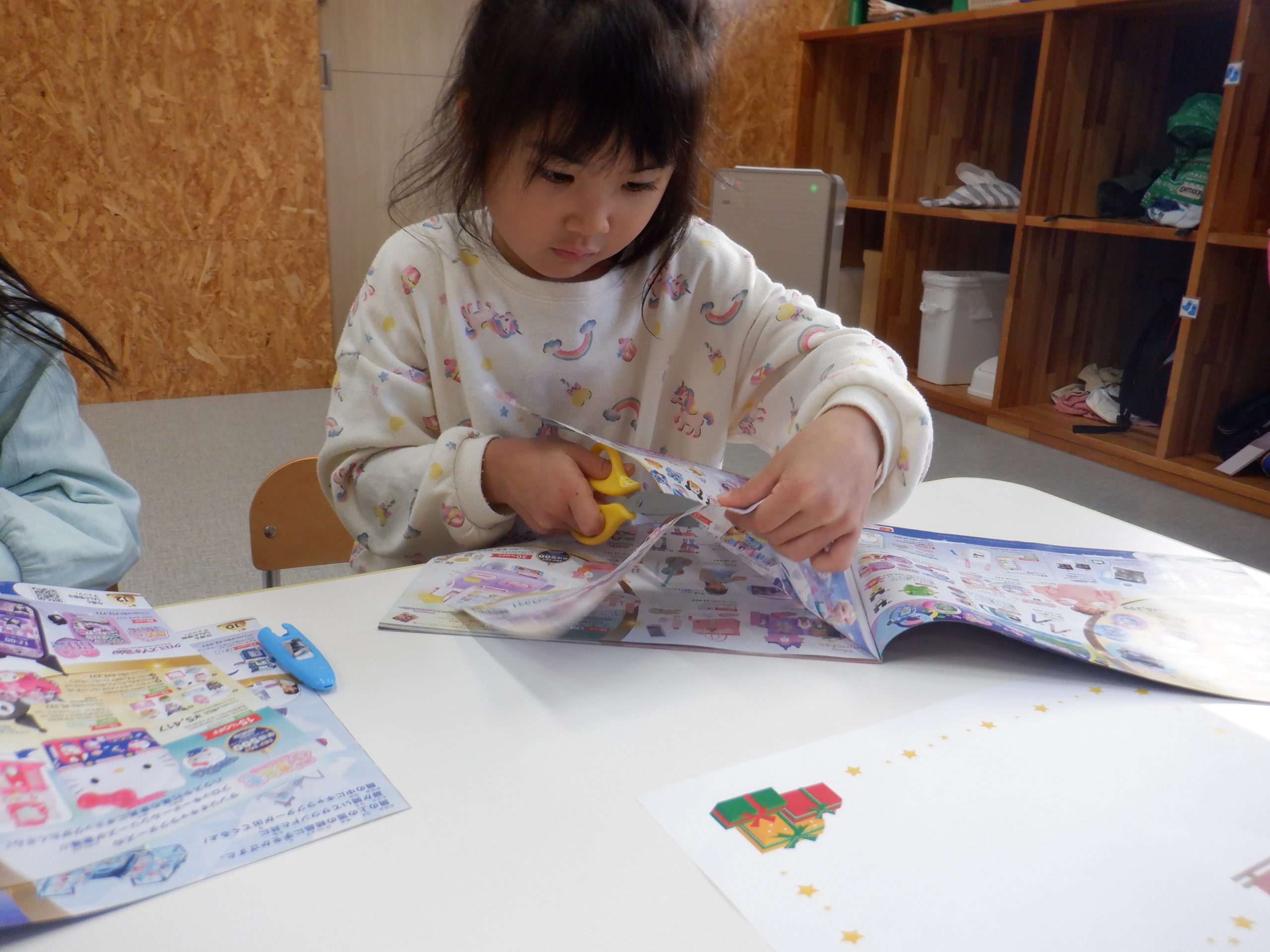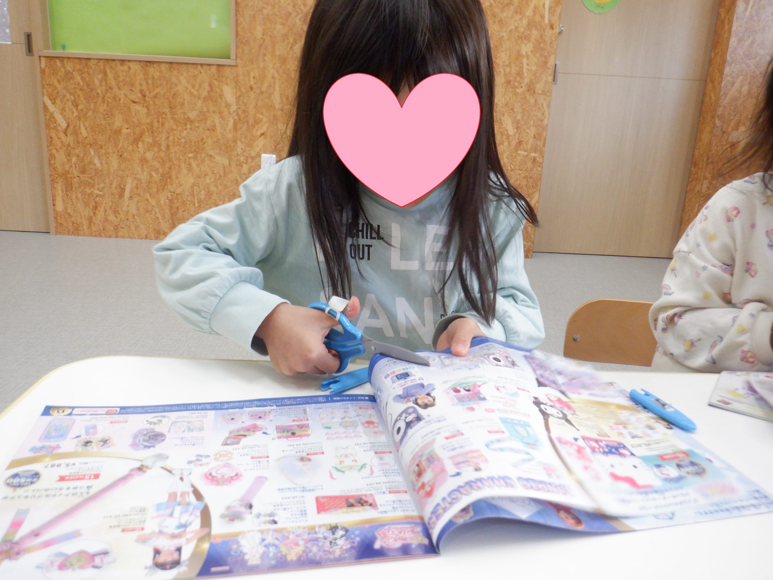 まずは、クリスマスプレゼントが掲載されている冊子から、自分の欲しいものを選んでハサミで切り取っていきました✂