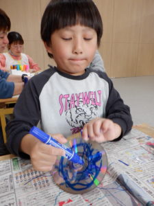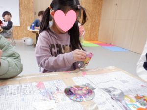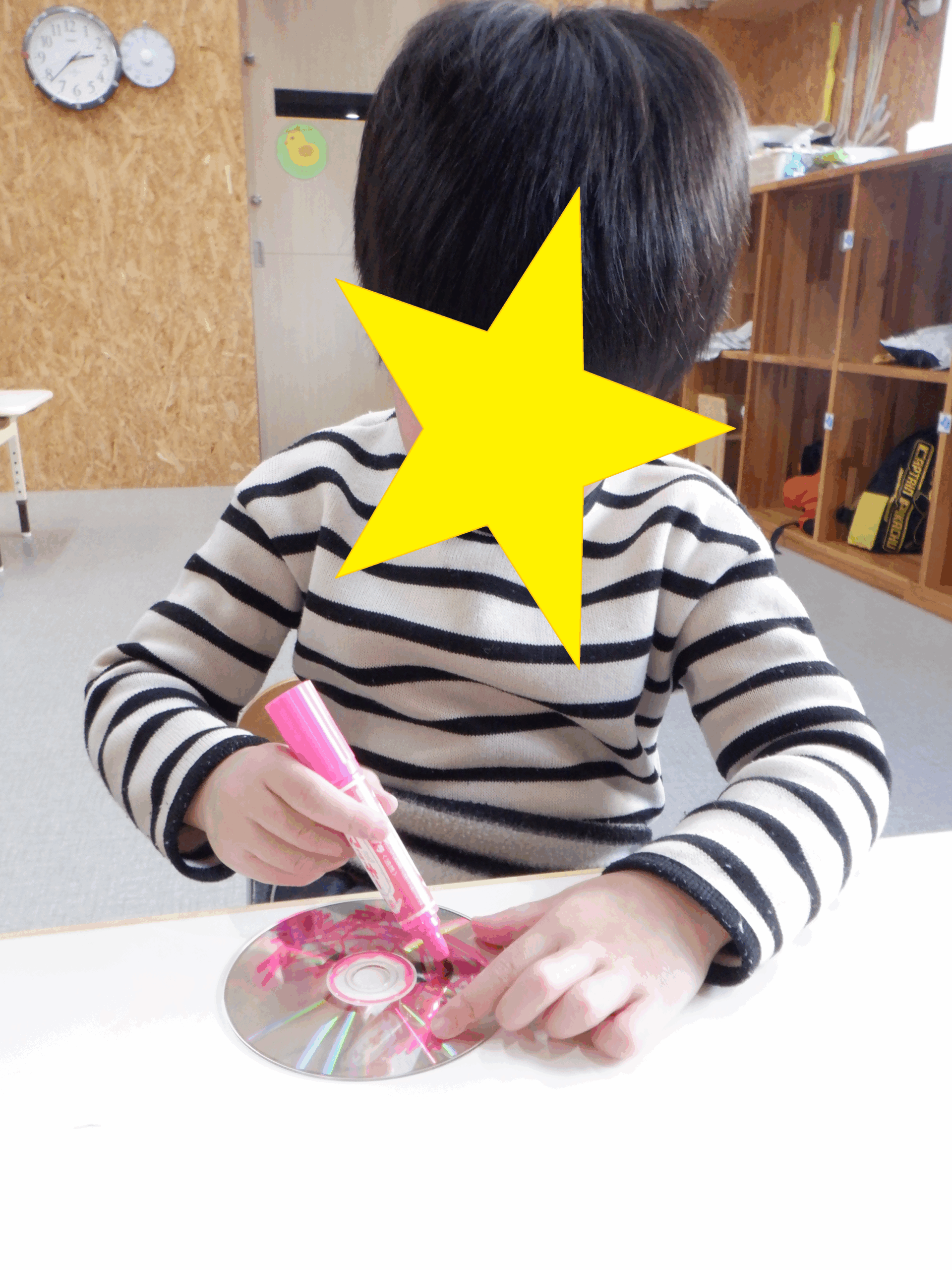 まずは、CDにペンで色を塗ったりシールを貼ってコマの表面をデザインをしていきます🌈