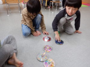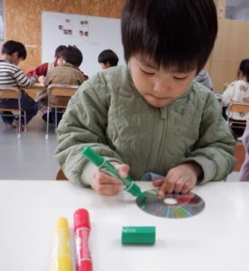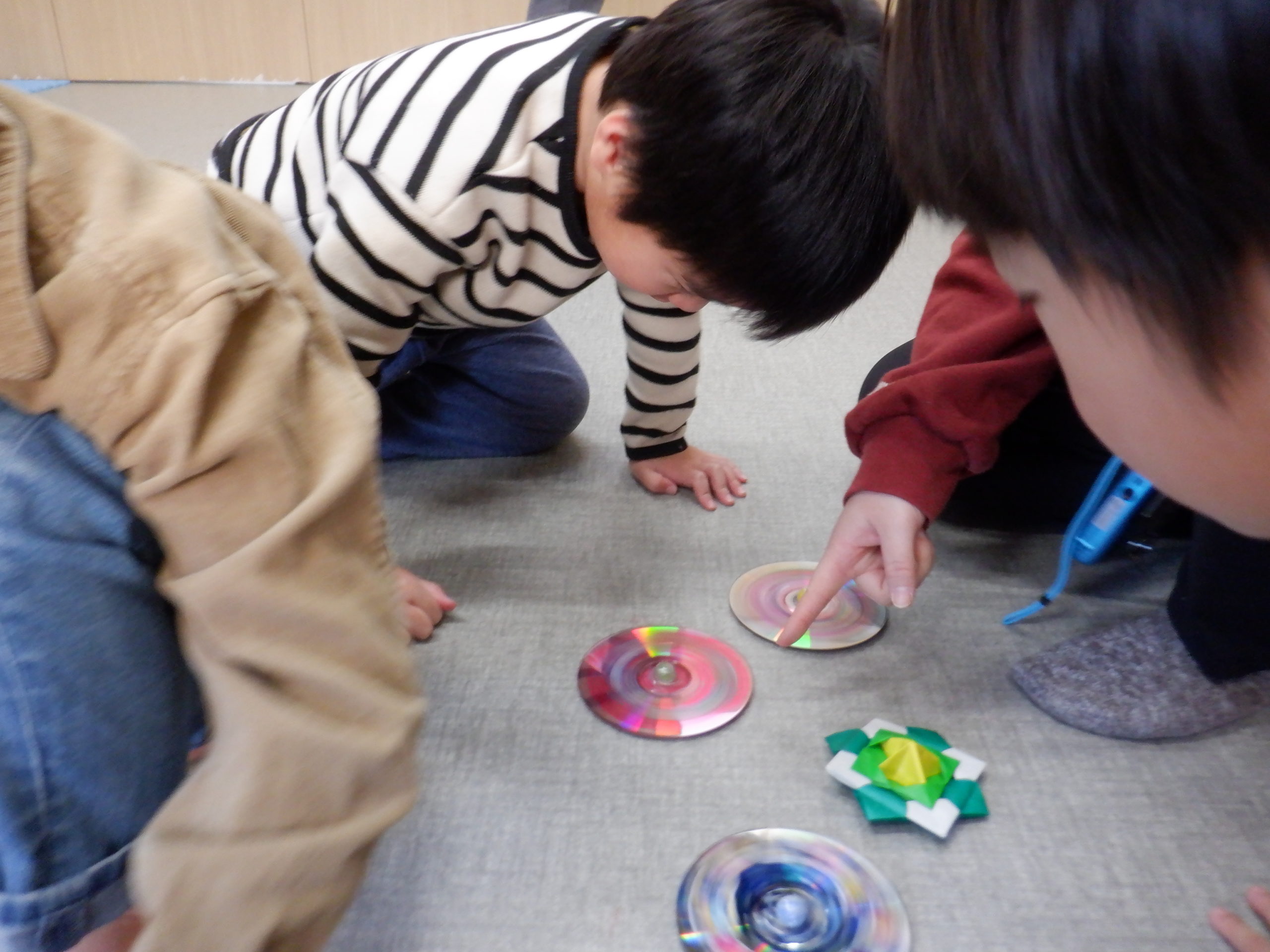 「コマ作るよ~」と見本のCDコマを見せると「わ~キレイ‼️早く作りた~い😆」と目を輝かせた子どもたち👨👩
