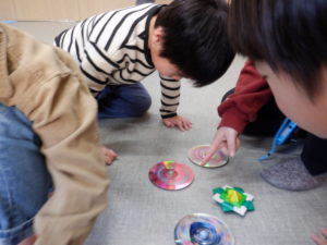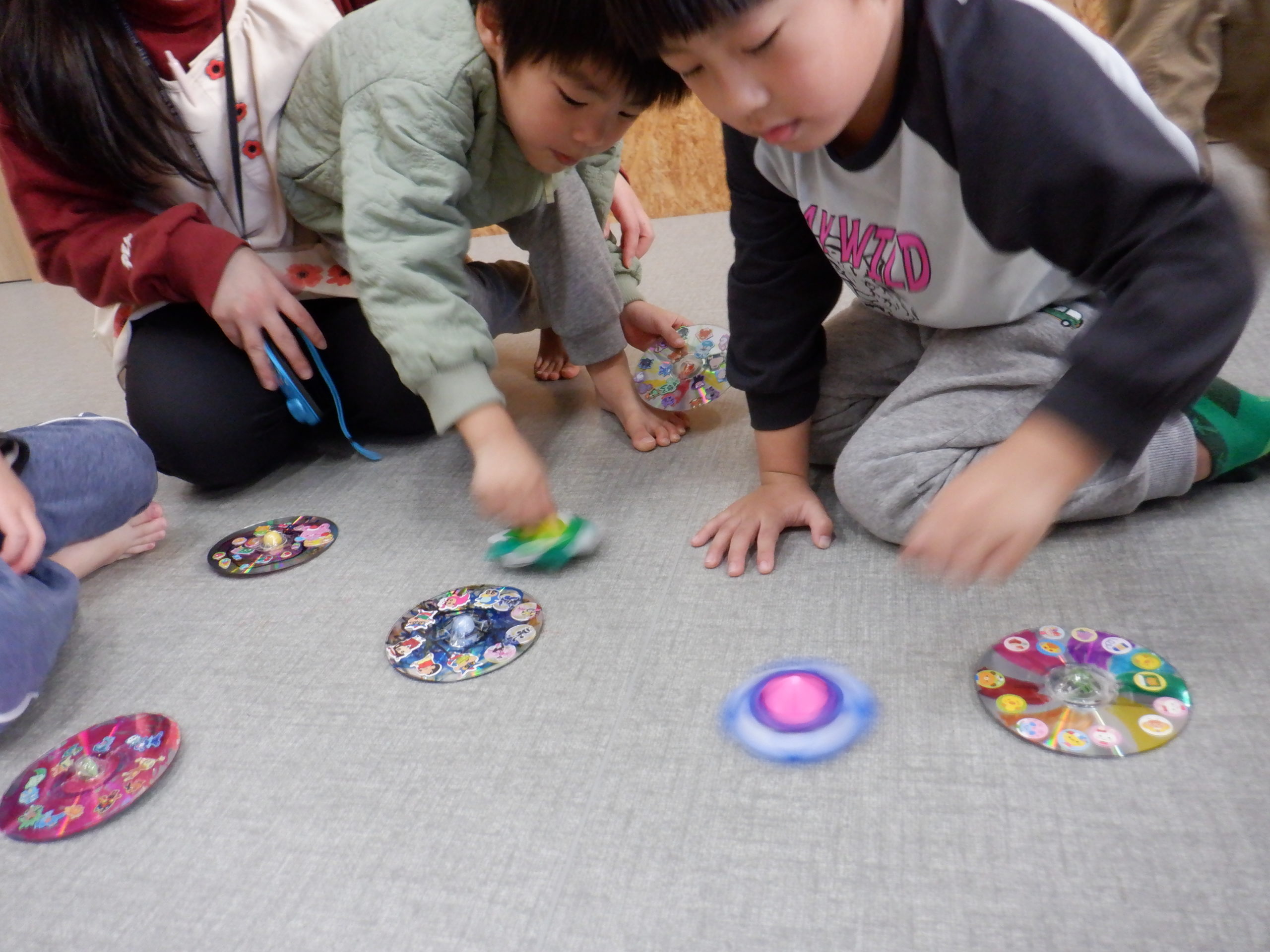 それぞれのコマが出来上がると、子どもたち自身で「回してみよう💞」「一緒に競争しようよ😊」と声をかけあって遊ぶ姿があちこちで見られました🍀