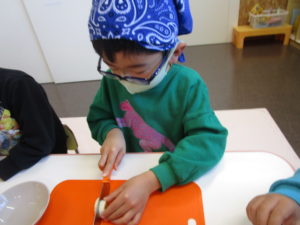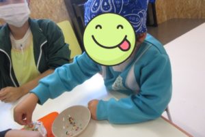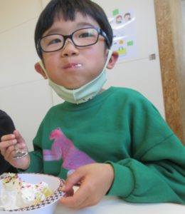 生クリームをケーキの土台に塗ったり、果物を切ったり、チョコスプレーをトッピングしたりなど友だちと協力して1つのクリスマスケーキを完成させました!