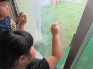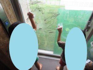 水で消える魔法のクレヨンを使って、窓にお絵描きを楽しみました(^^♪