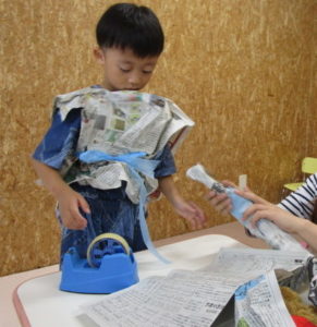 新聞紙を使って、服や剣など、好きなものを作りました😊💕