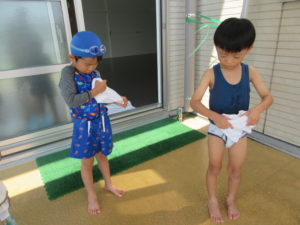 水遊びの中で、実際にタオルを泡立てて、体を洗う練習を行いました☺️