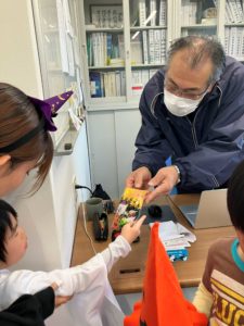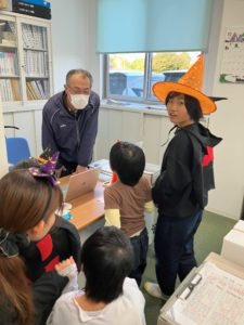 「トリック・オア・トリート!」🎃 お菓子を貰える魔法の言葉を言い、施設長からお菓子を貰いました😊