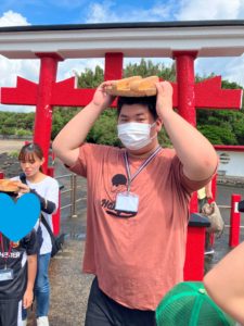 釜蓋を頭にのせて鳥居まで歩くチャレンジに挑戦しました!