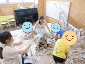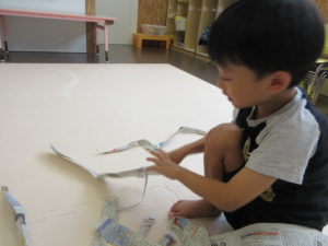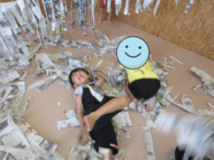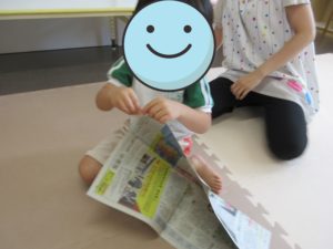 新聞紙を破って、お部屋いっぱいに広げて遊びました⭐