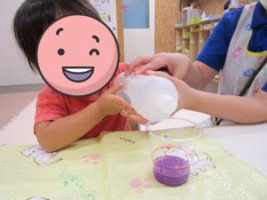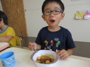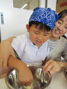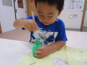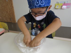 材料を入れてぐるぐる混ぜて、材料の形状が変わっていく様子にも興味を示しながら、完成させることができました✨