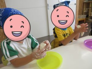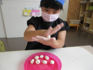 その中で、豆腐の柔らかい感触やお団子の手に付く感触などに親しむことができました🤗
