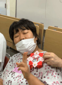 キッズの皆から とまとの利用者さんに折り紙メダルのプレゼントをして