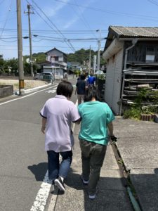 避難場所である薬師堂公園へは、職員と一緒に交通ルールを守り、怪我や事故等に