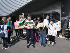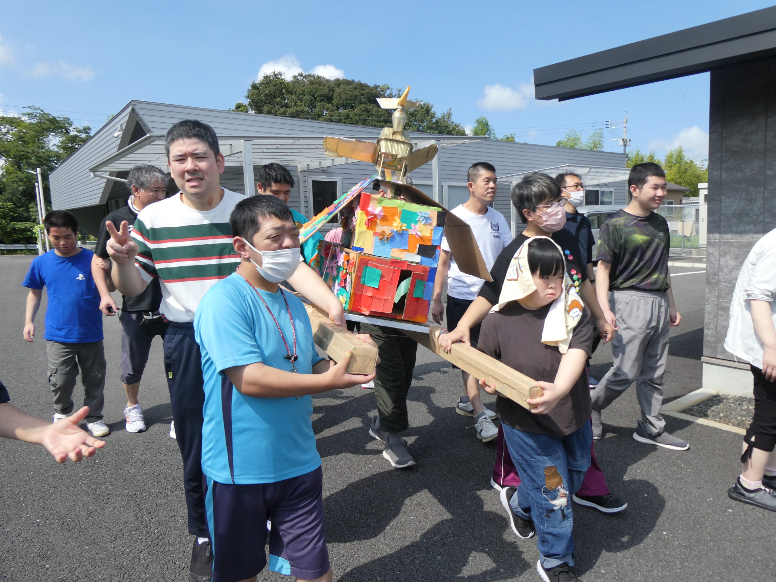 利用者の皆さんと一緒に作った手作り神輿を担ぎながら、「ワッショイ。ワッショイ。」のかけ声で元気よく歩きました。